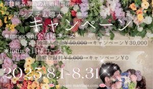 こんにちは😊✨西久保仁美です✨ 夏真っ盛りの毎日が続いていますが、皆様いかがお過ごしでしょうか?✨ さて、非接種者の為の結婚相談所innocentではこのたび、新しいシステムを導入いたしました✨ それに伴い、**8月1日 … 続きを読む 新システム導入&キャンペーンのお知らせ🪷